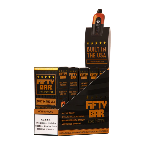 Secure the Gold Tobacco Fifty Bar 20K, a premium alternative to the foger switch pro disposable pods and smok novo 4 systems. With 18ml of premium juice, this device provides a richer profile than most disposable vapes. Shop now.